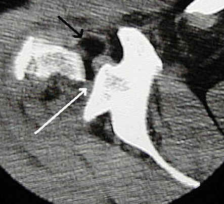 CT of the comminuted humeral fracture demonstrates fat just adjacent to the superior aspect of the glenoid. Notice the same attenuation between this and the fat inferior to the clavicle to the right of the image. The black arrow indicates fat, the white arrow indicates blood. Notice the interface between the two on this image.