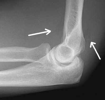 This lateral radiograph of the elbow demonstrates the presence of displaced anterior and posterior fat pads. This is abnormal and due to an undisplaced radial head fracture. There is no evidence of lipohemarthrosis.