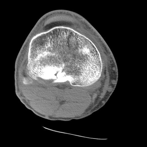Axial CT depicts the fracture involving the posterior aspect of the lateral tibial plateau, the source of the bone marrow producing the lipohemarthrosis.