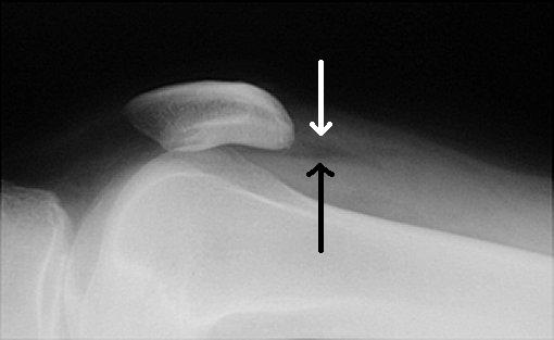 This cross table lateral view of the knee is the traditional way of viewing a lipohemarthrosis of the knee. Here, the black arrow indicates blood with fat (white arrow) layering superiorly. |