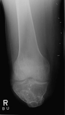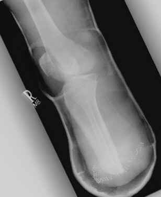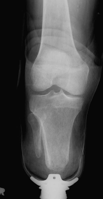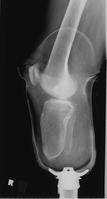Immediate post-operative films of a good BKA. Stump-shrinking cast and skin staples