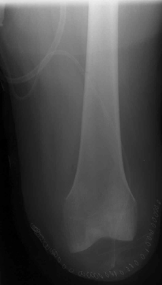 The image shown demonstrates an immediate post-operative knee disarticulation.