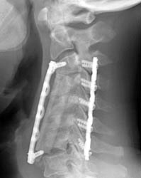 anterior fixation plate with screws at the C3 and T1 levels are identified. No