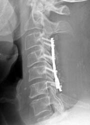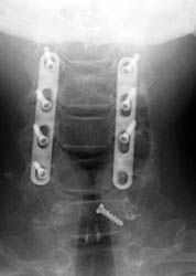 hospital. Note migration of left C6 screw. It has loosened and fallen out. This
