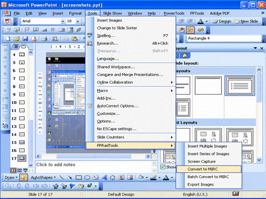 How to installAfter downloading the add-in, before installing set security level to medium from the tools menu. Again from the tools menu open the add-in window Add the ppRadTools to the add-in list A new menu item "PPRadTools" will be added at the end of the tools menu, with 6 submenus. |