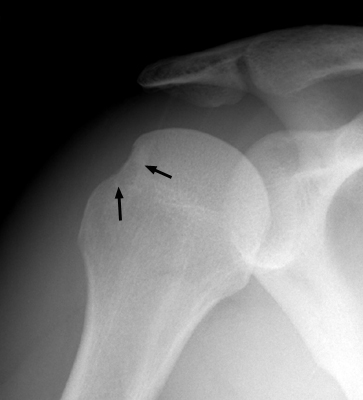 Frontal film of the right shoulder which reveals a defect of the posterolateral aspect of the humeral head, consistent with a Hill-Sachs deformity. The Hill-Sachs sign represents deformity of the superior, posterior border of the humeral head and is typically a result of impaction of the anterior inferior surface of the glenoid labrum on the posterolateral aspect of the humeral head during dislocation.