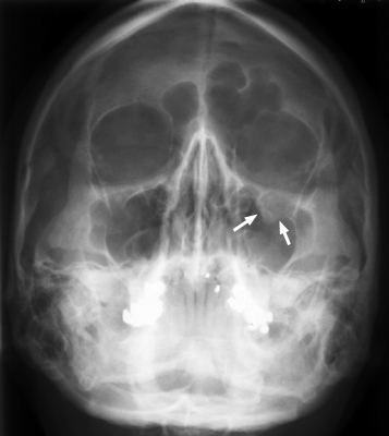 Diagnosis:Blowout fracture Discussion:The floor of the orbit is the most common portion of the orbit to sustain fracture. A classic radiographic finding in blow-out fractures is the presence of a polypoid mass (the tear-drop) protruding from the floor of the orbit into the maxillary antrum The tear-drop represents the herniated orbital contents, periorbital fat and inferior rectus muscle.