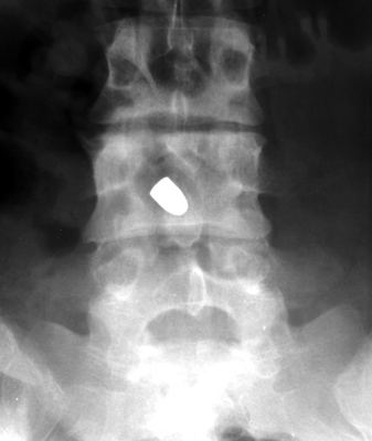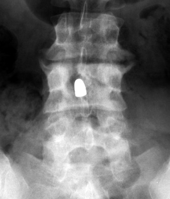 Diagnosis:Post traumatic bone cyst Discussion:Two sets of frontal and lateral radiographs, separated only by time, which reveal the "tumbling bullet sign"--which is simply a bullet which changes its location and orientation within a solitary bone cyst. This sign serves two purposes. It is documentation of the evolution of a solitary bone cyst as a corollary of trauma, and reveals the free movement of the foreign body within the confines of the lesion establishing its cystic rather than solid nature. It is similar to the fallen fragment sign. References: