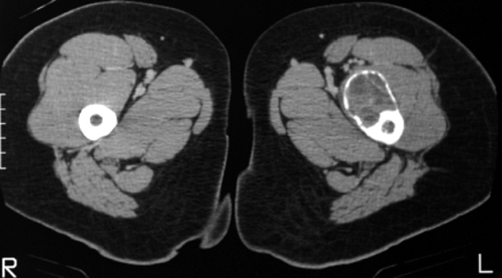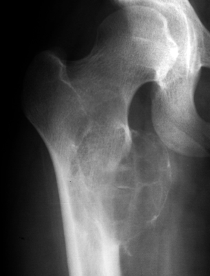 Frontal radiograph of the right hip and CT scan of the hips on a different patient. Both reveal a cystic bubbly lesion with fine internal septations. Additionally, compromise of the cortical margin of the lesion is present as well. The "blister of bone" sign refers to a bubbly cystic lesion with a saccular protrusion of the cortex with multiple fine internal septae. The shell of the lesion may fracture resulting in extravasation of blood into the adjacent tissues. This sign is highly characteristic of aneurysmal bone cyst.
