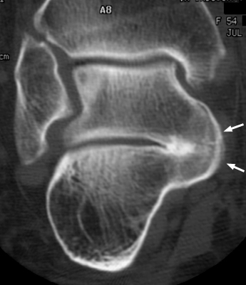 Diagnosis:Subtalar coalition Discussion:Lateral radiograph of the foot revealing a classic C sign which is a C-shaped line formed by the medial outline of the talar dome and the inferior outline of the sustentaculum tali. This is a sign of subtalar coalition. It is a reliable indicator of subtalar coalition on the lateral radiograph and represents the bony bridge between the talar dome and the sustentaculum tali. References: