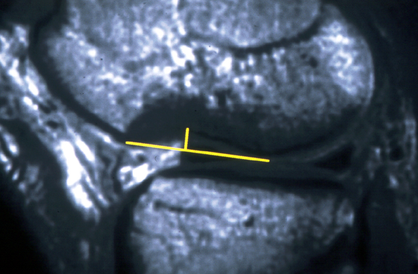 Diagnosis:ACL Tear Discussion:The deep lateral femoral notch (sulcus) sign is used as a secondary sign of ACL tear. The increased depth of the lateral femoral sulcus in patients with an ACL tear is due to impacted fracture, similar to a Hill-Sachs lesion of the humerus. This impaction occurs when the tibia becomes displaced anteriorly and the lateral femoral sulcus pushes against the posterior rim of the tibial plateau, causing an indentation in the femoral condyle. It is measured by drawing a line drawn tangential to the articular surface of the femoral condyle. This line is used as a reference and the depth of the sulcus is measured perpendicular to this line. Abnormally increased depth is known as the deep lateral femoral notch (sulcus). References: