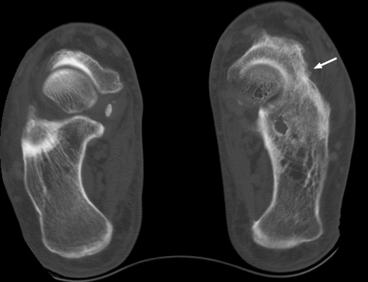 Diagnosis:Calcaneonavicular coalition Discussion:Plain film and CT images of calcaneonavicular coalition. Notice the elongated, tubular like extension of the anterior calcaneus seen on the lateral film; this imagery has been likened to the elongated nose of an anteater. There is abnormal bony fusion of the calcaneus and navicular bones, with the presence of a bony bar extending between these two bones. References: