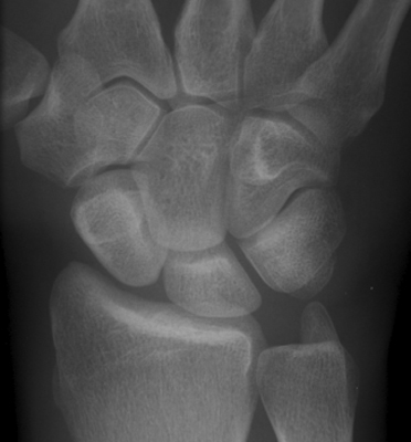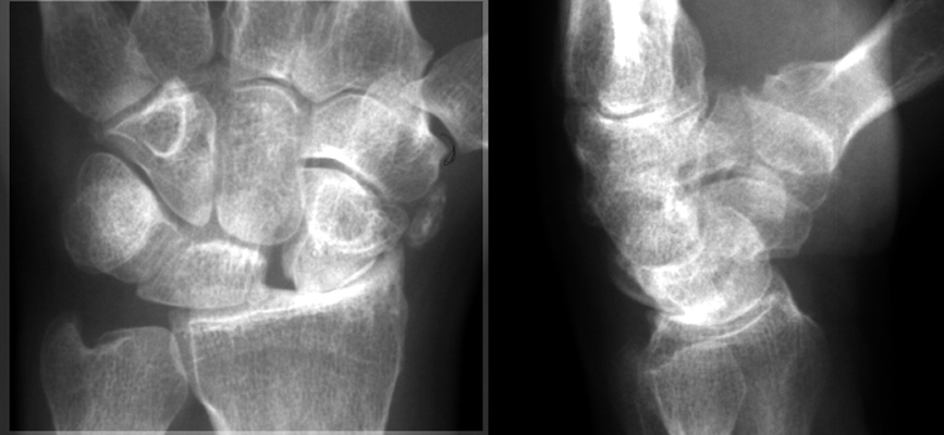 Diagnosis:Rotary subluxation Discussion:Multiple images of navicular disorientation with dislocation of the scapholunate joint. The scaphoid bone, seen along it long axis, has a ringed cortex appearance. This cortical ring sign is a sign of scapholunate dislocation, This sign was first described in 1970 in young patient with bilateral dislocation of the carpal naviculars. This sign (also known as the signet-ring sign) is caused by the abnormal orientation of the scaphoid. References: