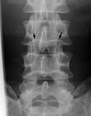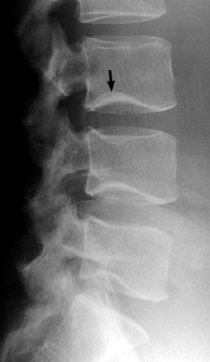 Diagnosis:Normal spine Discussion:Frontal and lateral radiograph of the lumbar spine with curvature of the inferior endplate of the 4th and 5th lumbar vertebrae, which mimics the curvature of Cupid's bow aimed cephalad. The unusual, non-flat surface of the inferior endplate is a normal variant, and need not be misinterpreted as inherent osseous abnormality or adjacent pathological process. References: