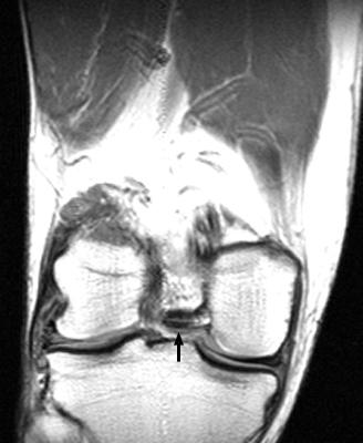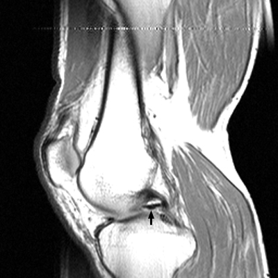Diagnosis:Bucket-handle tear of the menisci Discussion:The displaced fragment of a bucket handle tear of the meniscus can move medially to lie within the intercondylar notch. The fragment-in-notch sign is defined as a band like area of low signal intensity within the intercondylar notch, not appearing on the same slice as the PCL. The sign, when identified, can be valuable in picking up a bucket handle tear of the meniscus. References: