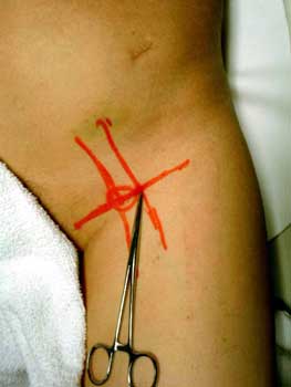 Femoral artery marked. Forceps at area of planned needle