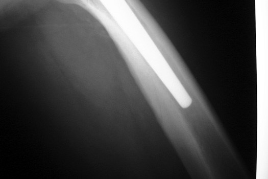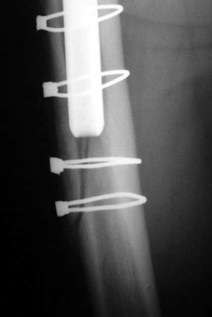 Femoral shaft fracture fixed with cerclage cables.
