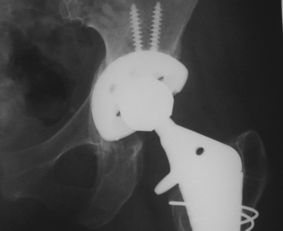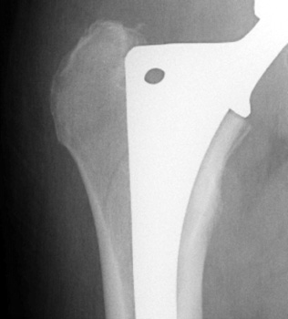 Control perforation lateral femoral cortex, reduced by cerclage cables. A control perforation of the lateral femoral cortex was performed in this revision total hip replacement to facilitate removal of the old femoral prosthesis. It is reduced by cerclage cables.