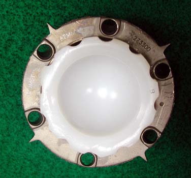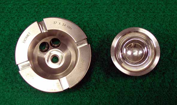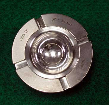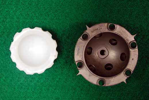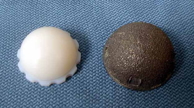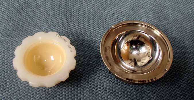 Metal acetabular cup with polyethylene liner, disassembled and assembled