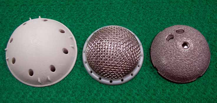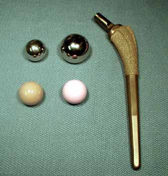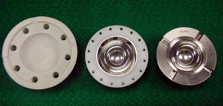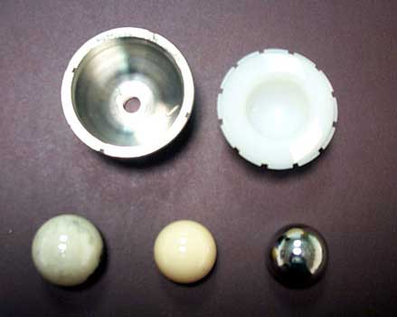 Metal acetabular cup with polyethylene liner disassembled, with various ceramic and metallic femoral component heads